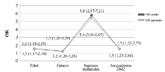 En cuanto a las características sociodemográficas y clínicas se puede apreciar que las variables género (p = 0,012), ingreso mensual (p < 0,001) y antecedentes familiares de DM2 (p = 0,025) fueron estadísticamente significativas, en contraste con la actividad física, el hábito de fumar, la hipertensión y obesidad, donde no se observó significancia (Tabla 2).