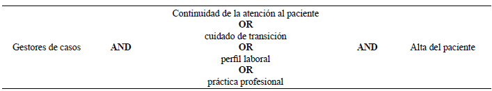 Para tal efecto, se consideraron los descriptores: alta del paciente, continuidad de la atención al paciente, cuidado de transición, gestores de casos, perfil laboral y práctica profesional, obtenidos de la biblioteca virtual en salud e incluidos en los descriptores en ciencias de la salud (DeCS). Las bases de datos consultadas fueron Scopus, Redalyc, Dialnet y SciELO. Se siguió la estrategia de búsqueda con los operadores booleanos que se muestran en la Figura 1.