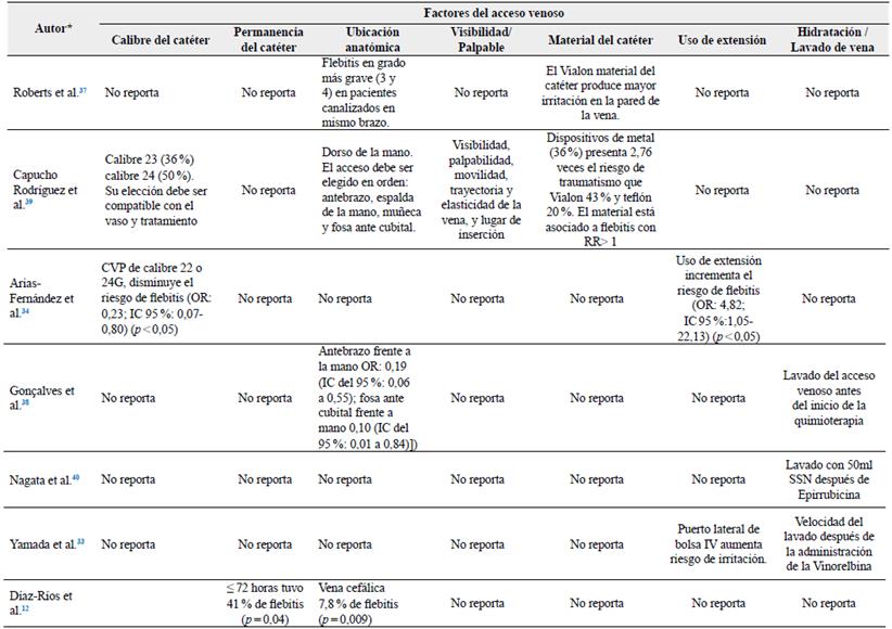 Tabla 3 Factores del acceso venoso asociados a la lebitis química hallados en los artículos de revisión.