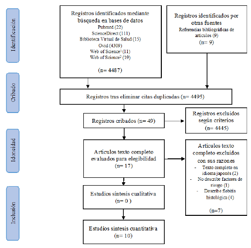 Se realizó una búsqueda en las bases de datos Scielo, Web of science, Ovid, Biblioteca Virtual de Salud, ScienceDirect y Medline. La estrategia se construyó con los términos MeSH y DeCS: Phlebitis, Risk Factors, Neoplasms, y Drug Therapy, con el operador booleano AND. Esta primera búsqueda arrojó un total de 4496 artículos. Se filtraron artículos publicados entre 2011 y 2020 para tener en cuenta la información más actualizada, en idioma español, inglés y portugués, y por tipo de artículo (research article, review article), obteniendo 50 artículos. Posteriormente, se eliminó una cita duplicada, y se aplicaron los criterios de selección, quedando un total de 17 artículos.