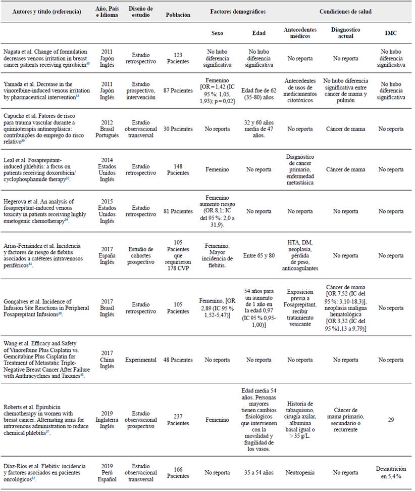 Los antecedentes clínicos, el diagnóstico y el IMC fueron las principales condiciones de salud asociadas a la flebitis en pacientes con tratamiento quimioterapéutico. Dentro de los antecedentes médicos se encontró la historia previa de cáncer, de enfermedad metastásica, hipertensión arterial, neutropenia, tabaquismo, vaciamiento ganglionar, hipoalbuminemia y uso de medicamentos citotóxicos12,33-35,37,38. Sobre el diagnóstico actual, cuatro estudios hallaron asociación entre el cáncer de mama y la flebitis35,37-39, donde incluso uno de estos estudios reportó OR de 7,52 (IC del 95 %: 3,10-18,3)] (38; también la neoplasia maligna hematológica aumentó el riesgo de flebitis con OR 3,32 (IC del 95 % 1,13 a 9,79) (38 (Ver Tabla 1).