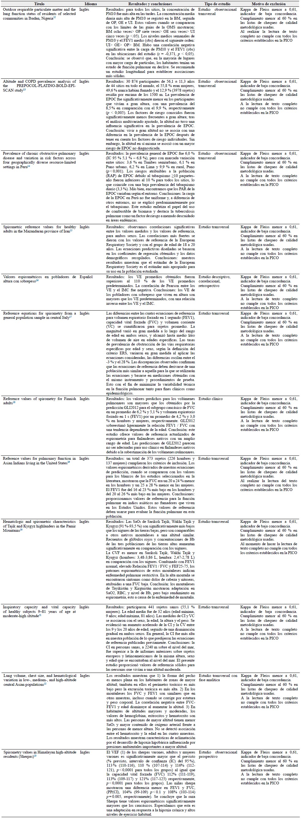 La revisión sistemática realizada permite evidenciar exposición a diferentes alturas en los 21 estudios incluidos, con uso de valores de referencia de Crapo, Khudson y Hankinson en alturas menores a los 1500 metros sobre el nivel del mar, y en alturas mayores, las ecuaciones de Nhannes III, Hedenstrom, Quanjer y ecuaciones de la Iniciativa Global de la Función Pulmonar (GLI).
