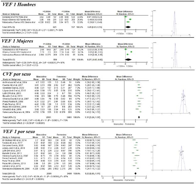 Los resultados de la presente revisión sistemática, por medio de la aplicación de un modelo de efectos aleatorios, permiten evidenciar diferencias iniciales respecto al VEF1 para ambos sexos de acuerdo con la altitud. Sin embargo, el I2 oscila entre 90 y 97 %, indicativo de alta heterogeneidad, lo que sugiere que los estudios no presentan el mismo efecto. Al comparar estos resultados con el estudio de Llanos Salcedo et al., en los varones hubo un ligero aumento del valor promedio de VEF1 en poblaciones que residen desde los 100 - 1000 m s. n. m hasta los 2300 - 2800 m s. n. m. y en las mujeres se evidenció un incremento del VEF1 en la medida que aumenta la altura8.