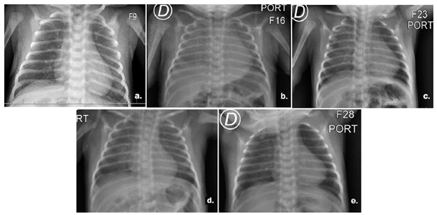 Figura 1a estudio normal; 1b. Velamiento en ambos hemitórax con predominio derecho. No se observa derrame pleural; 1c. Edema intersticial parahiliar de predominio derecho; 1d. Edema intersticial parahiliar de predominio derecho. No se observa derrame pleural; 1e. Leve engrasamiento peribroncovascular, silueta cardiaca dentro de límites normales. Ángulos cardiofrénicos y costodiafragmáticos libres.