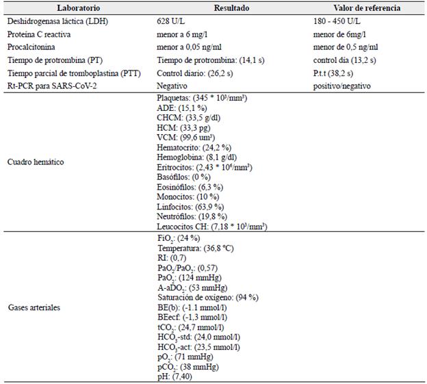 Paciente masculino de 38 días de vida con antecedentes de prematuridad y bajo peso al nacer (32 semanas y 1440 gramos al nacer), requirió de hospitalización en unidad de cuidado intensivo neonatal (UCIN) por 19 días, de los cuales 4 estuvo acoplado a ventilación mecánica invasiva. Ingresó al servicio de urgencias remitido del programa madre canguro por presentar cuadro clínico con 8 horas de evolución deterioro dado por retracciones subcostales y aleteo nasal sin otro síntoma asociado. Los signos vitales durante el examen físico fueron: frecuencia respiratoria de 65 latidos por minuto (lpm), frecuencia cardiaca de 135 lpm y saturación de oxígeno de 93 %. En la exploración cardiopulmonar presentó tirajes subcostales discretos y pausas respiratorias; fue hospitalizado en la unidad neonatal de cuidado intermedios neonatal y se inició manejo con oxígeno por cánula nasal a 3 litros por minuto, aislamiento protector, oximetazolina (0,025 %) a razón de 1 gota cada 8 horas en cada fosa nasal y terapia respiratoria con higiene nasal. En la radiografía de tórax no se encontró alteración, en cuanto a los exámenes sanguíneos, presentó un hemograma con niveles de hemoglobina compatibles con anemia (8,1 g/dl) con repercusión hemodinámica y se inició trasfusión de 40 cm3 de glóbulos rojos desleucocitados; los resultados de los demás exámenes paraclínicos solicitados fueron normales (Tabla 1).