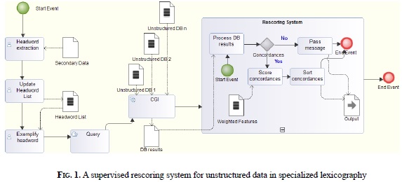 of a considerable amount of human work collecting materials to build a specialized dictionary. It has also been mentioned that this work is far from being completed. In the mere validation of secondary data, just a fourth of the collected materials have been searched in unstructured data bases. If a second round of queries was to be tried, in an attempt to improve the results obtained by the first documenting team, the work currently performed would represent slightly over a tenth of all the interaction with unstructured data bases expected in this project. One of the main problems is the search of words with several meanings that render long lists of concordances when queried in large data bases. Besides how little has been done in the documenting process, at the end of it just raw materials will have been collected and a great part of the dictionary-making process will be still pending. If this is true after investing near 3,000 hours of human work, something should be done to speed up the process and make it more efficient. In order to respond to this problem, this article proposes the construction of a supervised rescoring system. The architecture is not particularly complex and the most taxing aspect of it, which is the gathering of high quality training data, has already be done in this project. Despite its straightforward design, the proposed system is unprecedented in specialized dictionary making and if successful, it should be a clear contribution to this field.