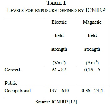 Furthermore the ICNIRP defined two tables with protection levels for NIR fields, one establishes the maximum population levels, i.e., to which the general population may be exposed and another table for occupational levels. In other words, the level to which staff are exposed when working with NIR fields. Thus, this employers association recognizes the existence of electric and magnetic field strength levels that might be a risk in humans. That is why users do not have to exceed them. The levels for radio frequency (3 KHz 300 GHz) are presented in Table I. where the highest levels corresponding to the lowest frequency [17].