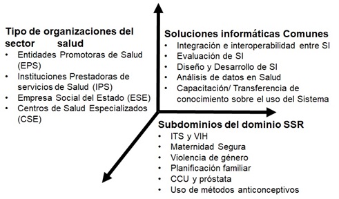 La escalabilidad del FrameD-SIS se puede representar en tres dimensiones, como se observa en la Figura 2; sin embargo, el framework puede escalar a otros dominios del sector, nuevas soluciones informáticas y otros tipos de organizaciones que puedan participar en el sector salud. Estas dimensiones son extraídas de los componentes de FrameD-SIS: i) dimensión dominio y subdominio, preliminarmente diseñado para representar las líneas de SSR; ii) dimensión soluciones informáticas comunes, que pueden desarrollarse usando FrameD-SIS; y iii) dimensión organizaciones del sector salud, permite la articulación de los actores relacionados con la prestación de servicios de salud. Por ejemplo: una Entidad Promotora de Salud (EPS) decide evaluar los SI utilizados para reportar información desde las Instituciones Prestadoras de Salud (IPS) sobre maternidad segura. En ese caso, el tipo de organización sería las EPS, el subdominio sería maternidad segura y la solución informática sería Evaluación de SI.