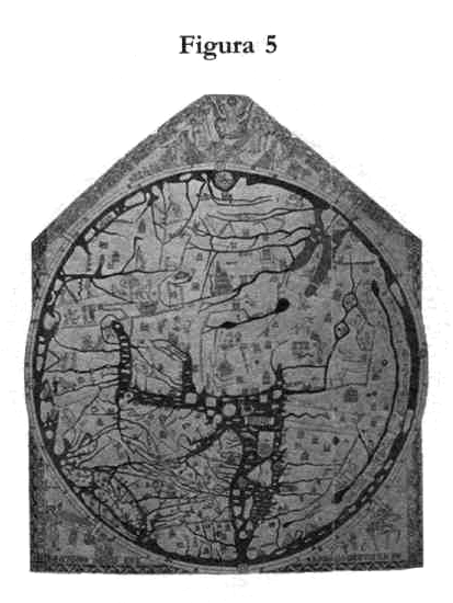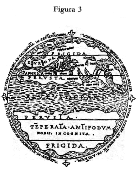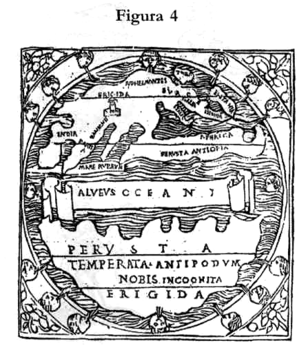 La historia de la concepción de las Antípodas se puede reducir a dos referentes: por un lado, puede denotar una zona del mundo donde todo ocurre al revés concepción cosmológica de un anti-mundo-, o por otro, puede referirse a una raza pliniana marcada en los pies concepción ethno-antropológica de una raza de monstruos que habita las lejanías. La primera idea nos viene de la doctrina de las zonas, legado de la Antigüedad. Ésta promulga que la tierra se divide en cinco partes, una en el centro siendo una región tórrida infranqueable que separa al mundo habitado del desconocido Fig. 3 y 4-. La segunda, que se proyecta en una tradición cartográfica medieval inspirada en las ideas de San Agustín, por un doble movimiento, convierte a las Antípodas en una raza monstruosa a la vez que en una región alejada del mundo donde habitan todos los monstruos. Lo importante de esta concepción, que se ha denominado como mapa T/O Fig. 5-, radica en que posiciona a Jerusalén en el centro del mundo y sitúa lo inexplorado en la periferia lejana. Estas dos visiones geográficas son también antropológicas: "el término de Antípodas puede aplicarse a dos tipos de personajes: unos pueblan la parte opuesta del globo y caminan patas arriba, los otros, con los pies al revés, habitan los parajes lejanos (no necesariamente del lado opuesto)"4.