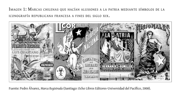 Dentro de ese marco ideológico, en Chile comenzó hacia el cambio de siglo una búsqueda identitaria basada en lo cultural, que escarbaba en el pasado en búsqueda de tradiciones y representantes raciales originarios. Aquello contrastaba con el simbolismo nacional decimonónico, en el que la idea de nación se había formado a partir de los principios ilustrados que sostuvieron el proceso de independencia6. Hasta ese momento, "Chile" se representaba en términos republicanos, como es posible ver por ejemplo en la gráfica publicitaria de diversas marcas que a fines del siglo xix apelaban a conceptos como "patria" o "nacional" asociándolos a símbolos importados de la iconografía de la Revolución Francesa, Marianne incluida, junto a la bandera y el escudo del país (imagen 1). Ahora, cuando la nación comenzaba a ser concebida como una entidad de existencia anterior a su formación como república -momento al que preexistiría en términos étnicos y culturales-, la simbología republicana comenzó a ser reemplazada por contenidos folclóricos e indigenistas. La representación de la nación en la Exposición Iberoamericana tendría que hacerse cargo, por ende, de las características étnicas y culturales que se volvían protagónicas en los imaginarios.