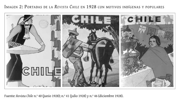 A fines de la década del veinte, los "tipos chilenos" ya se habían consolidado como símbolo de lo nacional, llegando incluso a ser incorporados y promovidos por esferas oficiales. Ejemplo de ello son las portadas que en 1928 publicó la revista Chile, boletín del Ministerio de Relaciones Exteriores para promover al país en el exterior. Los mapas geográficos de las portadas del año anterior dieron paso a coloridas ilustraciones que mostraban a los personajes típicos del país (el huaso, el araucano, el artesano) haciendo aquí de embajadores de "lo chileno" ante un público extranjero (imagen 2).