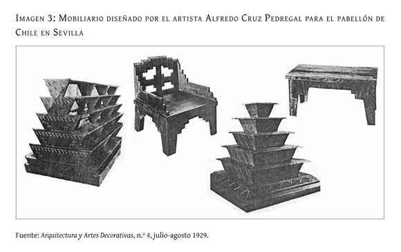 No obstante lo anterior, la fidelidad al "espíritu nacional" era tan grande que nadie planteó buscar referencias en otras partes para los aspectos artísticos de la presentación. Los motivos aborígenes nacionales habrían de ser los preferidos por el solo hecho de ser "propios", se indicaba en Zig-Zag54, y aunque no hubieran alcanzado la madurez de otros, completaba otro medio, serían llevados a Sevilla "sin rubor"55. Simplemente había que intentar hacer algo noble a partir de ellos56. El citado columnista de El Mercurio concluía: "Si la trutruca se sabe tocar bien, la trutruca puede ser un motivo primordial de una música que allá jamás han escuchado"57. De este modo, el artista encargado de diseñar el mobiliario del pabellón, Alfredo Cruz Pedregal, se inspiró en las formas decorativas del arte araucano para desarrollar las diferentes piezas. Diseñó estanterías, sillas y banquetas de madera basándose en las composiciones escalonadas del arte mapuche, que aplicó tanto en el contorno exterior de los objetos como en las figuras decorativas que iban talladas y pintadas sobre ellos58. Este mobiliario fue distribuido en diversas salas del pabellón, y sirvió para sostener con un toque "nacional" objetos tan diversos como muestrarios minerales y fotografías de paisajes para el turista59 (imagen 3).