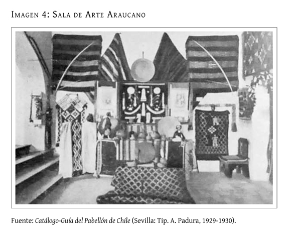 Los grupos sociales y culturales que habían hecho su entrada reciente a los imaginarios nacionales no sólo estuvieron presentes en Sevilla como referente para un arte típico creado por otros, sino que sus expresiones, cultura y cosmovisión también fueron incorporadas en la muestra como objeto en sí. "Por primera vez -se destacaba- el araucano y el indio porteño de Chile aparecerán reflejados en algo más que en los fáciles adjetivos del poeta"60. En un hecho totalmente inédito, se habilitaron dos salas en el segundo piso del pabellón para la Sección de Arte Araucano y Popular. Hasta entonces en los pabellones de Chile en el exterior había bastado con Salones de Bellas Artes para dar la nota cultural. Ahora, la Subcomisión de Bellas Artes del Comité Organizador preparó, además de las tradicionales muestras de cuadros y esculturas, la exhibición de muestrarios de objetos típicos del arte campesino y de la industria mapuche, objetos que fueron recolectados a lo largo del país por la artista y miembro de la Subcomisión, Elena Montero de Leiva. Así, en la Sala de Arte Araucano se exhibieron telares, alfombras, ponchos, alfarería, instrumentos musicales, platería y armas de origen mapuche, mientras en la Sala de Arte Popular se dispusieron canastitos de Panimávida, tejidos de lana de fabricación doméstica, gredas de Quinchamalí, tejidos en crin y raíces, y juguetes de trapo fabricados por campesinos, aperos de montar, monturas y espuelas. Además se montaron, en dioramas iluminados, escenificaciones de las costumbres y tradiciones tanto de araucanos como de campesinos, y se exhibió la reproducción de una ruca araucana con todos sus atributos (imagen 4)61.