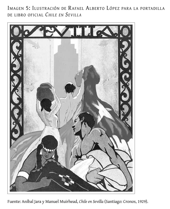 La portadilla del libro oficial de la concurrencia, Chile en Sevilla, es ilustrativa acerca del lugar que se otorgaba al indígena en la representación del país (imagen 5). En el dibujo aparecen cuatro personajes ordenados de arriba abajo en forma jerárquica, y el color de sus pieles -blanco arriba y oscuro abajo- refuerza dicha jerarquía en términos raciales. El personaje superior, un hombre blanco representando a las élites del país, es quien guía al resto hacia el progreso luminoso simbolizado en un rascacielos. El personaje araucano no sólo se encuentra en el último lugar, sino que es el único que en vez de mirar hacia adelante vuelca su mirada hacia atrás y hacia abajo, como si no sólo le diera la espalda al progreso, sino que además mostrara su sumisión ante la cultura dominante. Resalta también el hecho de que mientras los demás personajes son representaciones ideales de raza, género y ocupación, identificados como tales mediante símbolos evocativos simples, el personaje araucano está tan sobrecaracterizado con objetos y detalles decorativos que refuercen su identidad como miembro de dicha etnia, que su persona misma llega a desaparecer bajo ellos. Esto, que se repetía en la representación de la mujer mapuche en el mural de Guevara o en la portada 40 de la Revista Chile, evidencia que el gran aporte de su mundo era proporcionar una "estética nacional" y llenar el significante vacío de los "rasgos propios". Aquello resulta una verdadera metáfora de su situación en la realidad del país en aquellos años. El indígena de carne y hueso no gozaba de la misma simpatía que su representación simbólica, y tras su incorporación al territorio nacional hacia 1880, no había acuerdo sobre su rol en el país. Los mismos que aprovechaban su estética en la representación nacional (como el presidente Ibañez) abogaban por que en el mundo real los araucanos fueran integrados rápidamente a través de la asimilación cultural y el fin de las tierras comunales78, sin preocuparse de que esa cultura que había prestado imágenes al nacionalismo cultural terminara por desaparecer como expresión "viva".