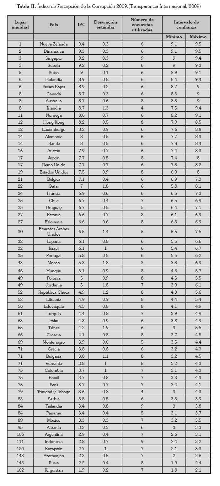 30. Transparencia Internacional (2009c). Tabla de resultados 2009. Extraído Febrero 8, 2013 desde http://www.transparencia.org.es/INDICE%20DE%20PERCEPCI%C3%93N%202009/Tabla%20sint%C3%A9tica.CPI_2009_table_spanish.pdf [ Links ]
