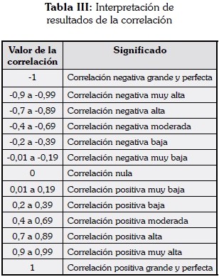 El coeficiente de correlación de Pearson, también conocido como correlación producto momento de Pearson, es una medida de relación lineal entre dos variables continuas. Los valores que adquiere esta correlación se encuentran entre -1 y +1. Por lo que, si tenemos una correlación +1 significa que existe una relación lineal directa perfecta (positiva), es decir, las puntuaciones bajas de la variable (X) se asocian con las puntuaciones bajas de la variable (Y), mientras que las puntuaciones altas de X se asocian con los valores altos de Y. Una correlación -1 significa que existe una relación lineal perfecta (negativa) entre las dos variables. Puntuaciones bajas en X se asocian con los valores altos de Y, mientras las puntuaciones altas en X se asocian con los valores bajos en Y. En el caso de una correlación 0 se interpreta como la inexistencia de una relación lineal entre las dos variables estudiadas (Elorza, 2000). Castejón aporta la siguiente tabla, en la cual se especifican posibles resultados del índice de correlación y su significado (Castejón, 2011, p. 96).