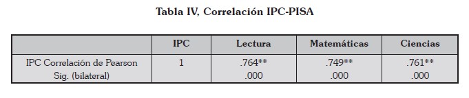 La tabla IV, que se muestra a continuación, contiene los resultados de correlación estadística que se presentan al aplicar el coeficiente de correlación de Pearson a los resultados IPC y PISA que se mostraron previamente en las en las tablas I y II.10