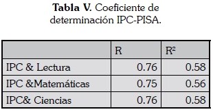 De la misma manera, el coeficiente de determinación12 permite comprobar que la correlación es alta, ya que hasta un 58% de las variaciones en las diferentes asignaturas de la prueba PISA se relacionan con variaciones en los resultados del IPC, como se muestra en la tabla V.
