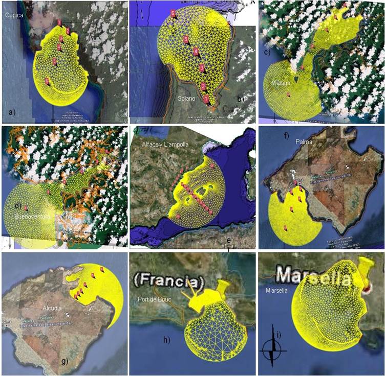 La batimetría utilizada para la simulación de las condiciones son: para bahía Cupica y Solano ha sido la obtenida de las Cartas Náuticas COL. 30, 31. 116, 502; para Buenaventura y Málaga, de las Cartas Náuticas COL. 150, 153 306 760 del Centro de Investigaciones Oceanográfico e Hidrográfico (CIOH) de DIMAR en Colombia y de España, para Alcuida y Palma, las cartas náuticas 48, 48e, 47 y 384 para Alfacs y L´Ampolla, las cartas 48 y 485 del Instituto Hidrográfico de la Marina Española y para Francia, la carta Náutica 49 del mismo instituto (Figura 1).