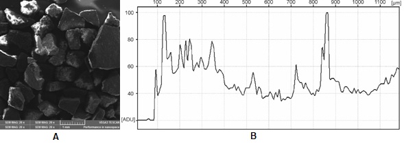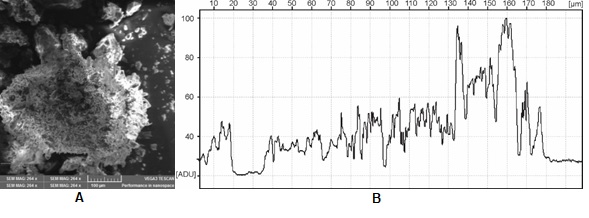 Figura 3 Partículas de cáscara de huevo de 200 µm de diámetro obtenidas mediante microscopia de barrido electrónico. A) Micrografía estructural. B) Perfil de variación superficial.
