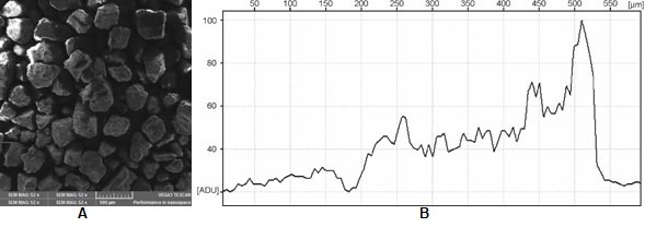 Figura 2 Partículas de cáscara de huevo de 400 µm de diámetro obtenidas mediante microscopia de barrido electrónico. A) Micrografía estructural. B) Perfil de variación superficial