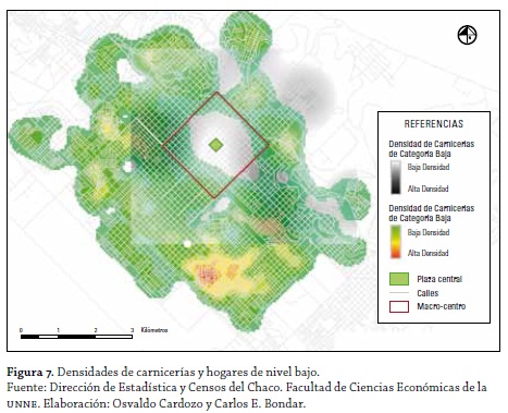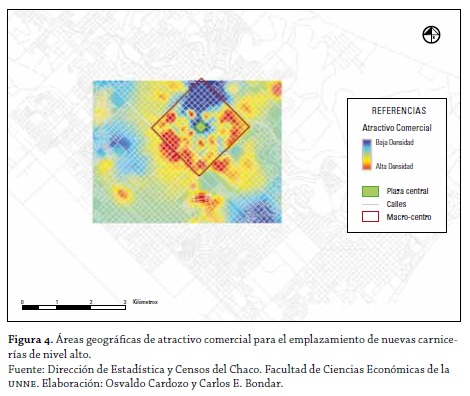 Existe una franja que abarca el sur y el oeste de la ciudad, aproximadamente a 3 km de la plaza central, que presenta los mayores índices de atractivo comercial para los nuevos emplazamientos de carnicerías que atiendan a los estratos medios (figura 6).