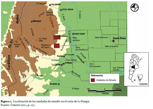 Con la finalidad de reconstruir las estrategias de vida campesinas, en el trabajo se utilizaron distintos materiales empíricos, en los que se combinaron el análisis de estadísticas con entrevistas en profundidad e interpretación de diversas fuentes. Se analizaron documentos audiovisuales, publicaciones académicas, informes técnicos, fotografías e información primaria recopilada durante el trabajo de campo realizado en las unidades de estudio (figura 1) entre los años 2002 y 2010. Además de contar con encuestas de la totalidad de los grupos domésticos, se realizaron 38 entrevistas en profundidad a campesinos/as e informantes del extremo oeste de La Pampa. La triangulación de las estrategias metodológicas, fuentes de datos y perspectivas, posibilitó la combinación de abordajes y un enriquecimiento de la información obtenida, superando, de esta forma, los sesgos propios de una determinada metodología.
