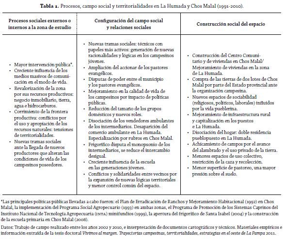 Los cambios se aceleraron entre 1970-1990, cuando el Estado provincial comenzó a intervenir en la zona mediante distintas políticas públicas, y gradualmente se valorizó la región. La llegada de agentes extralocales alteró las condiciones de vida de los crianceros, las actividades productivas, los espacios de socialización y las subjetividades. Además del Estado, las redes evangélicas lentamente construyeron un nuevo poder en torno a la figura del pastor. Asimismo, la mayor influencia de los medios de comunicación, unida con el accionar de maestros y técnicos, generaron nuevas formas de pensar que fueron resignificadas por las generaciones de jóvenes campesinos y produjeron tensiones intergeneracionales. Estos procesos se profundizaron en el período 1991-2010 cuando, junto con las nuevas racionalidades de los campesinos, avanzaron el proceso de mercantilización y el accionar de los agentes extralocales. En este contexto, los conflictos por el uso y la apropiación de los recursos naturales y la construcción social del espacio salieron a la luz, como puede observase en la tabla 1, en la que se sintetiza esta etapa.