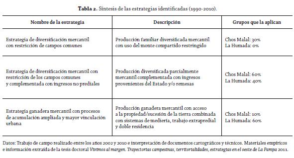 En los últimos diez años (2000-2010), ante la revalorización de los espacios peri y extrapampeanos, y ante el avance del capitalismo y de las lógicas territoriales de tipo empresarial en el extremo oeste de La Pampa, las unidades domésticas están redefiniendo sus prácticas productivas-reproductivas. Se concibe a las estrategias como construcciones sociales producto del sentido práctico de los sujetos; como acciones y formas de percepción realizadas en forma permanente que permiten el desarrollo de procesos de producción-reproducción de los grupos (Bourdieu 2004 y 2007). La capacidad de acción, de intervención y de movilidad de recursos depende de la posición de los sujetos en el campo social, la lógica del mismo y las situaciones particulares en las que se encuentren comprometidos (Gutiérrez 2004). Por ello, las líneas de acción no están determinadas por factores estructurales, y tampoco son un simple producto de una decisión libre e individual. De modo que existe en los agentes sociales un margen de elección y de acción condicionado por los factores estructurales.