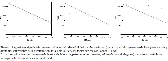 La figura 2 presenta las relaciones encontradas entre la precipitación y la densidad de la madera (Ramirez, Molina y Bernal 2010). Se nota que la densidad de la madera tiene relación inversa con la precipitación. Ello se debe a que durante los períodos de estiaje del río Sinú, la salinidad aumenta en la bahía de Cispatá, por ende los árboles aumentan la densidad de la madera para reducir la conducción del agua dentro del xilema y, por tanto, la vulnerabilidad a la cavitación y el embolismo de los vasos (Maherali, Pockman y Jackson 2004; Melcher et ál. 2001). En épocas de lluvia, la salinidad del agua de mar es menor y los árboles crecen más rápido, disminuyendo la densidad de la madera y permitiendo un mayor flujo de agua. La precipitación es, entonces, un sustituto de la salinidad del mar, de la cual no existen mediciones de largo plazo. Estos resultados abren la posibilidad de reconstruir las precipitaciones locales y la salinidad del mar con Rhizophora mangle.