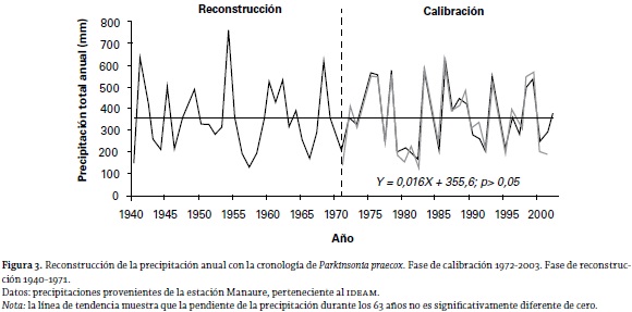 En la figura 3 se presenta la reconstrucción de la precipitación total de la media Guajira con Parkinsonia praecox. Nótese la clara similitud entre las líneas que representan los datos instrumentales y los reconstruidos con los anillos de Parkinsonia praecox en la fase de calibración, lo que permitió reconstruir esta variable entre 1940 y 1971, hasta donde alcanzaba la cronología de los anillos, pero no existía información instrumental continua. La línea de tendencia resultó con pendiente no significativamente diferente de cero, con confiabilidad de 95%; es decir, los resultados no presentan evidencia de cambios en esta variable durante los 63 años de la cronología residual de Parkinsonia praecox.