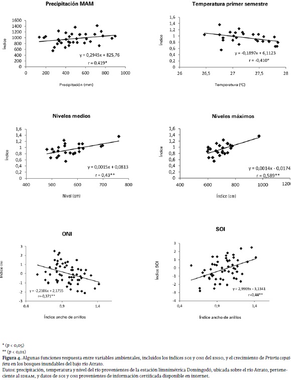 En la figura 4 se observa que Prioria copaifera responde negativamente a la temperatura del aire, y positivamente a las precipitaciones; esta última respuesta quizá se deba a una covariación entre niveles del río y la precipitación, pues parece difícil establecer un nexo de causalidad en una especie que habita en un medio en el cual nunca es escasa el agua, aun durante la fase de estiaje. La variable que más influye en el crecimiento de Prioria copaifera son los niveles del río Atrato, con los cuales se alcanzan correlaciones positivas altamente significativas. Esto implica que la especie crece más cuando la inundación es mayor. Las correlaciones trimestrales y anuales entre la cronología residual y los índices SOI y oceanic Niño index –en adelante, ONI– del ENSO fueron generalmente significativas y negativas para el SOI, lo contrario para ONI, lo que demuestra la alta sensibilidad de la especie a las señales del ENSO que tienden a aumentar la precipitación en la región (Herrera y del Valle 2011).
