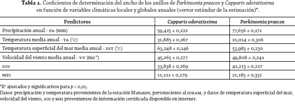 Los análisis de radiocarbono demostraron que ambas especies tienen anillos anuales (Ramirez y del Valle 2011a; 2011b). En la tabla 1 se observa que Parkinsonia praecox es mucho más sensible a la precipitación anual y que Capparis odoratissima lo es a las temperaturas del aire y de la superficie del mar. En cuanto a los índices globales SOI y MEI, Parkinsonia praecox supera ampliamente en sensibilidad a Capparis odoratissima (tabla 2).