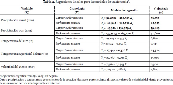 Analizando la señal climática contenida en los anillos mes a mes, Capparis odoratissima detecta las primeras lluvias de la temporada lluviosa –que se presenta principalmente en los meses de SON– desde el mes de agosto, cuando estas apenas se insinúan. Por el contrario, Parkinsonia praecox es menos sensible a estas precipitaciones tempranas. Ambas especies responden negativamente y, usualmente, significativamente a las temperaturas mensuales de La Guajira. Parkinsonia praecox parece afectarse más negativamente que Capparis odoratissima con las altas temperaturas (figura no mostrada). En la tabla 2 se presentan las funciones de transferencia. Solo resultaron estadísticamente significativas, con confiabilidad de al menos 95%, las cronologías de las precipitación anual y durante SON en ambas especies, pero Parkinsonia praecox supera a Capparis odoratissima. Esta última especie fue la única que correlacionó significativamente con la TSM. Las demás variables no tuvieron suficiente ajuste para emplearlas en la reconstrucción climática.
