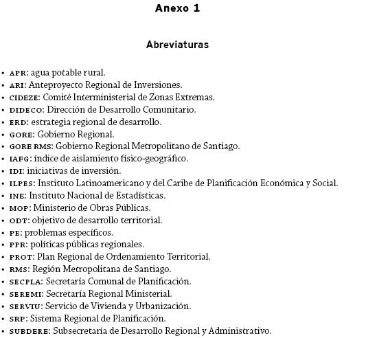 1Entre estos se destacan los realizados por Arenas, Quense y Salazar (1999), y el Ministerio del Interior y la SUBDERE (1999).2Los principios de esta política son: buscar la equidad social, aspirar a lograr una equidad territorial, ser subsidiaria, ser excepcional, ser soberana y buscar fortalecer la descentralización.