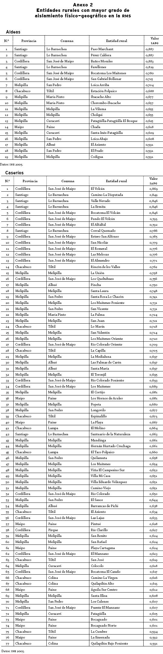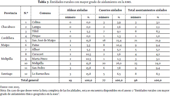En la tabla 7 se encuentran los principales datos de las entidades rurales con mayor grado de aislamiento identificadas para la RMS, según el IAFG. De las 23 comunas en donde había presencia de entidades rurales (tabla 6), solo en 12 de estas se localizan los 96 asentamientos más aislados. En términos de su concentración, pueden advertirse dos comunas: San José de Maipo y Melipilla, que tienen un total del 45,9% de las entidades rurales mencionadas. Respecto a las provincias, la que más presencia tiene es Melipilla, con 44 de estas, que representan un 45,8% del total.