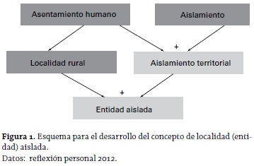 Considerando los conceptos descritos, para el presente estudio se propone la siguiente definición de 'entidad aislada': asentamiento humano de característica rural que presenta condiciones o tendencias hacia el aislamiento, lo que implica una ausencia o dificultad con respecto a la conectividad y a la accesibilidad de las personas que allí habitan. Dicha situación puede estar condicionada por factores como: la distancia, el clima, el relieve, el agua, las actividades económicas y la localización de la población.