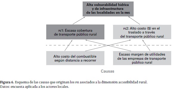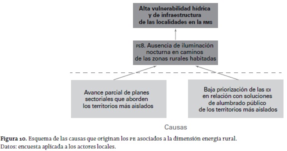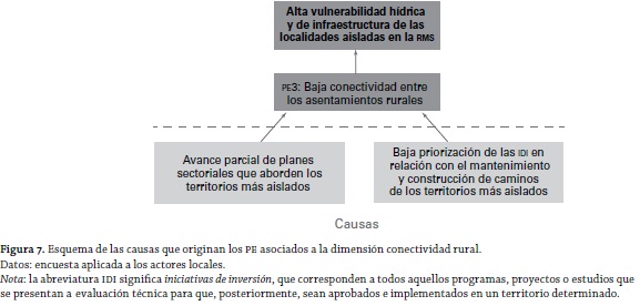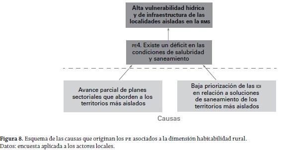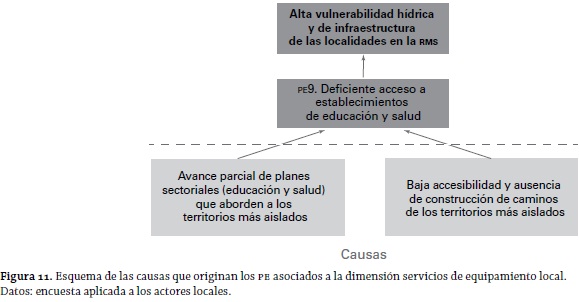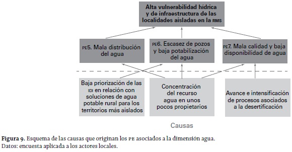 En relación con las causas de los PE, las figuras 6, 7, 8, 9, 10 y 11 dan cuenta de una estructura jerárquica (árbol de las causas del problema) en la que pueden apreciarse tres eslabones: el inferior corresponde a las causas propiamente tales, en el que se observa que existen casos de "causas comunes" a PE; el segundo eslabón (intermedio) corresponde a la identificación de los PE ya identificados anteriormente (según la dimensión de análisis), manteniéndose el código señalado en la tabla 8; y, finalmente, el eslabón superior se plasma a partir del análisis de todos los diversos PE presentados por los actores locales. De esta forma, considerando la multiplicidad de las dimensiones del problema, se llega a determinar que el problema general es: una alta vulnerabilidad hídrica y de infraestructura en las entidades aisladas de la RMS. Es de destacarse la falta de satisfacción existente acerca del uso de un recurso estratégico (agua) y la carencia con respecto a la infraestructura en general (de distinto tipo). Con esto, puede deducirse que la problemática de las entidades rurales más aisladas es de tipo multidimensional.