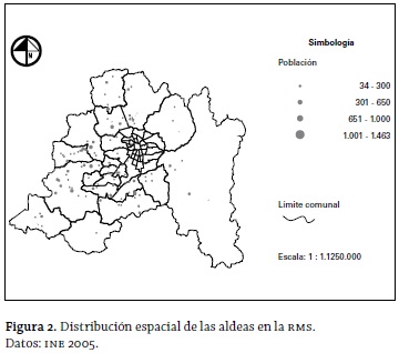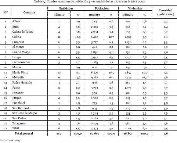 Para el 2002, las aldeas suman un total de 110 entidades con poco más de 60.000 habitantes (INE 2005). Se observa en la tabla 5 una concentración, principalmente en cuatro comunas: Colina, María Pinto, Melipilla y Paine. Estas conforman el 41,8% del total de asentamientos, el 46,8% de la población y el 46% de las viviendas. Desde el punto de vista de la densidad poblacional, se destacan los casos de las comunas de Lo Barnechea (valor más alto) y San José de Maipo (valor más bajo). El primer caso se explica porque dos, de las tres aldeas identificadas, tienen una vocación funcional minera, ya que se asocian con la mina Disputada de Las Condes, concentrando un número relevante de población, en relación con las viviendas disponibles del campamento minero. El segundo caso se explica porque las entidades rurales identificadas tienen una vocación de turismo, tanto invernal (ski) como estival, por encontrarse en un paisaje de alta montaña.
