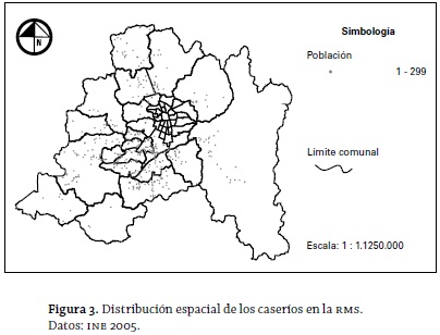 En la figura 3 se presenta la distribución espacial de los 390 asentamientos georreferenciados con categoría de caserío; se aprecia una dispersión hacia los ejes norte, occidental y sur de la región (de características rurales, al igual que en el anterior caso de las aldeas). En el sector oriental de la RMS, se observa una disposición lineal de entidades que van siguiendo una ruta desde la Metrópoli de Santiago hasta el Cajón del Maipo, en plena cordillera de Los Andes.