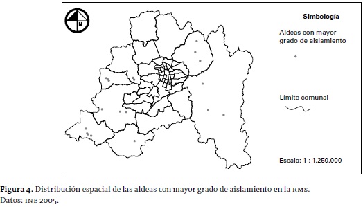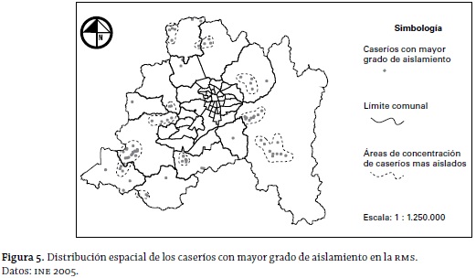 En las figuras 4 y 5, se advierte la distribución espacial de las aldeas y caseríos (respectivamente) con mayor grado de aislamiento en la región. Particularmente en los caseríos se ha estimado conveniente destacar, con una línea segmentada (ver simbología de la figura 5), la existencia de patrones de concentración espacial de las entidades más aisladas, los cuales superan los límites político-administrativos de las comunas. Estos territorios "cruzan" dichos límites, generando una concentración de entidades más aisladas de carácter "intercomunal"; entre los que pueden mencionarse los casos de: Melipilla-San Pedro (sector sur-poniente de la región), Colina-Tiltil (sector norte de la región) y Melipilla-Curacaví (sector poniente de la región).