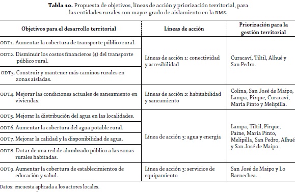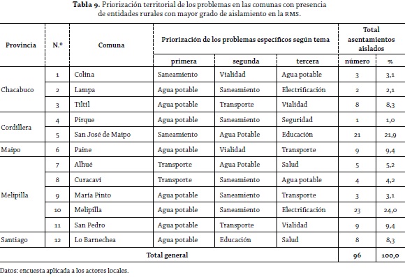 Una vez indicada la identificación del problema general y de los problemas específicos, se pasó a conocer cómo estos se presentan y se priorizan en las diversas comunas de la región que tienen asentamientos en condición de mayor aislamiento (tabla 9). Con esto puede deducirse que la problemática de las entidades rurales más aisladas es territorialmente diferenciada.