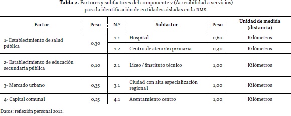 En la tabla 2 se observa el componente 2 (Accesibilidad a servicios), en donde se considera la distancia que media entre los servicios más básicos (salud y educación) y la población, y la que hay hasta la capital comunal, en donde se prestan todos los servicios asociados a la municipalidad respectiva (registro civil, prestaciones sociales, permisos y patentes).