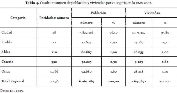 A partir de la tabla 4, pueden apreciarse datos del contexto estudiado, destacándose en negrita los asentamientos con categoría de aldea y caserío, entidades rurales a las que se les aplicó el modelo IAFG. Se observa que las aldeas y caseríos suman un total, en la RMS, de 500 asentamientos rurales, y que, al 2002, alcanzaban una población de 91.492 habitantes, con 26.038 viviendas.