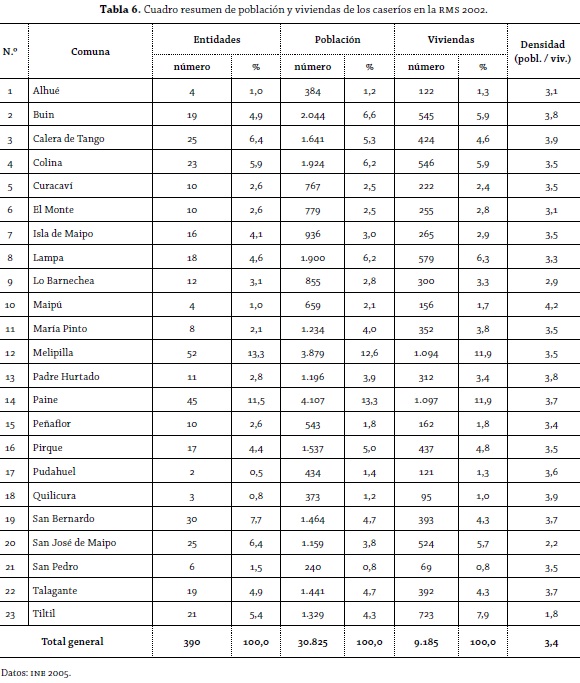 En la tabla 6 se encuentra la distribución de los 390 caseríos, totalizando casi 31.000 habitantes para el 2002 (INE 2005). Desde el punto de vista de la concentración espacial, se identifican principalmente siete comunas: Buin, Calera de Tango, Colina, Melipilla, Paine, San Bernardo y San José de Maipo. Estas conforman el 56,1% del total de asentamientos, el 52,5% de la población y el 50,2% de las viviendas. Con respecto a la densidad poblacional, nuevamente se destacan las comunas de Lo Barnechea, San José de Maipo y se agrega Tiltil. Todo ello se explica porque los caseríos identificados tienen una vocación de turismo estival, por encontrarse en un paisaje de alta y media montaña.