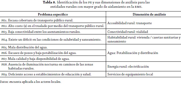Durante el trabajo en terreno y la aplicación de las fichas en las 12 comunas en donde hay presencia de asentamientos rurales con mayor grado de aislamiento, se identificaron nueve problemas específicos –en adelante, PE–, que son los que se pueden apreciar en la tabla 8. Junto a cada uno de ellos se realizó un trabajo de categorización, asociado a una dimensión de análisis cuyo propósito fue el ordenamiento de estos, lo cual es sustentado en el desarrollo de sus causas.
