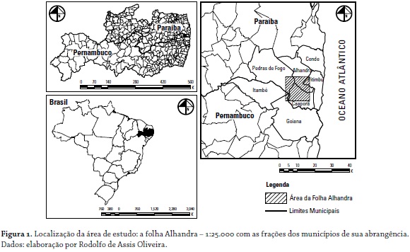 A área de estudo, delimitada pelas coordenadas 7°22'00" e 7°30'00"; 35°00'00" e 34°52'30" (norte - sul, oeste e leste, respectivamente), abrange porções de seis municípios, sendo quatro paraibanos: Alhandra, Caaporã, Pedras de Fogo e Pitimbu e dois pernambucanos: Itambé e Goiana. Ambos os estados, localizam-se na Região Nordeste do Brasil (figura 1).