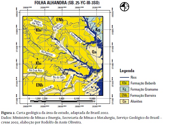 Nos vales dos rios Aterro, Taperubus, Papocas e Dois Rios e dos riachos Sal Amargo e Acaís, ocorrem afloramentos das Formações Beberibe e Gramame pertencentes à Bacia Sedimentar Pernambuco-Paraíba, sotopostas à Formação Barreiras e aos sedimentos quaternários (figura 2), que foram exumados devido à intensa erosão hídrica que escavou nos tabuleiros da área vales profundos e fortemente entalhados, formando vertentes com elevadas declividades, superiores a 45% em alguns trechos.