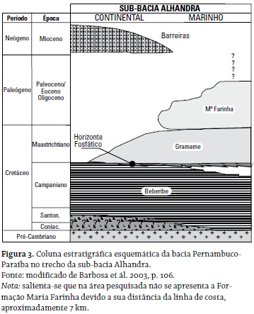 Segundo Mabesoone e Alheiros (1991), a Formação Beberibe trata-se de uma sequência essencialmente arenosa, com uma espessura média de 200 m, em geral sem fósseis, constituída de arenitos friáveis, de cinzentos a creme, mal selecionados, com componente argiloso. Com relação à Formação Gramame, De Brito Neves et ál. (2009) afirmam que corresponde ao máximo da transgressão do Grupo Paraíba na sub-bacia Alhandra, sendo constituída de rochas carbonáticas claras, calcários argilosos, alguns arenitos calcários, com um horizonte fosfático basal (figura 3). Sua ocorrência foi verificada excepcionalmente nos vales do rio Aterro e Papocas.