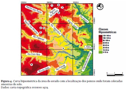 Como esse trabalho é de caráter geomorfológico, deve-se considerar que a geomorfologia está em pertinência com a pedologia e que a percepção das relações entre seus respectivos objetos de estudo depende da compreensão dos processos dinâmicos atuantes na superfície da crosta terrestre, os quais são responsáveis pela configuração do relevo e gênese dos solos, ou seja, da morfogênese e da pedogênese. Por esta razão, foram selecionados dez pontos para coletas de solos para análises laboratoriais, principalmente nos topos aplainados dos tabuleiros mais elevados da área, com altitudes superiores a 100 m, exceto o ponto 9, que se encontra na classe de 40 a 60 m (figura 3).